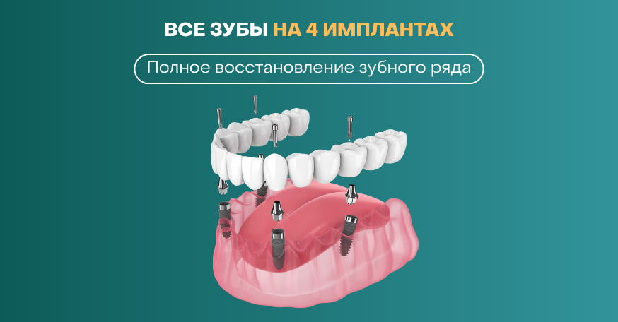 Все зубы на 4 имплантах — надёжное, быстрое и безболезненное решение для полного протезирования челюсти. Уже в течение суток — новые зубы.